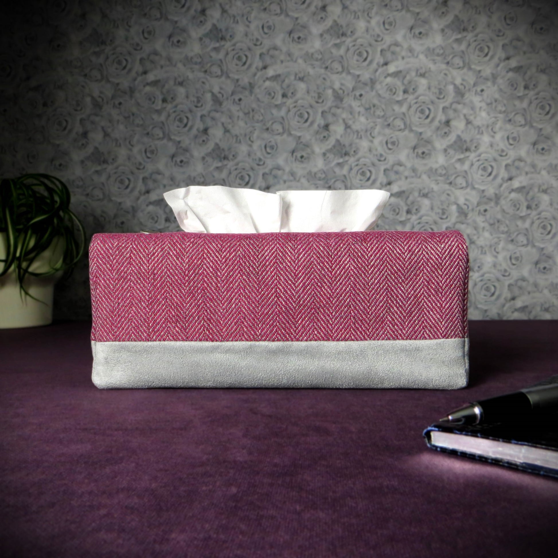 This rectangle polyester mauve and grey herringbone fabric tissue box cover is carefully made by hand in our Glasgow, Scotland studio. Featuring a light grey velvet base, it includes a black lining and silver finish Celtic knot buttons with black cord.