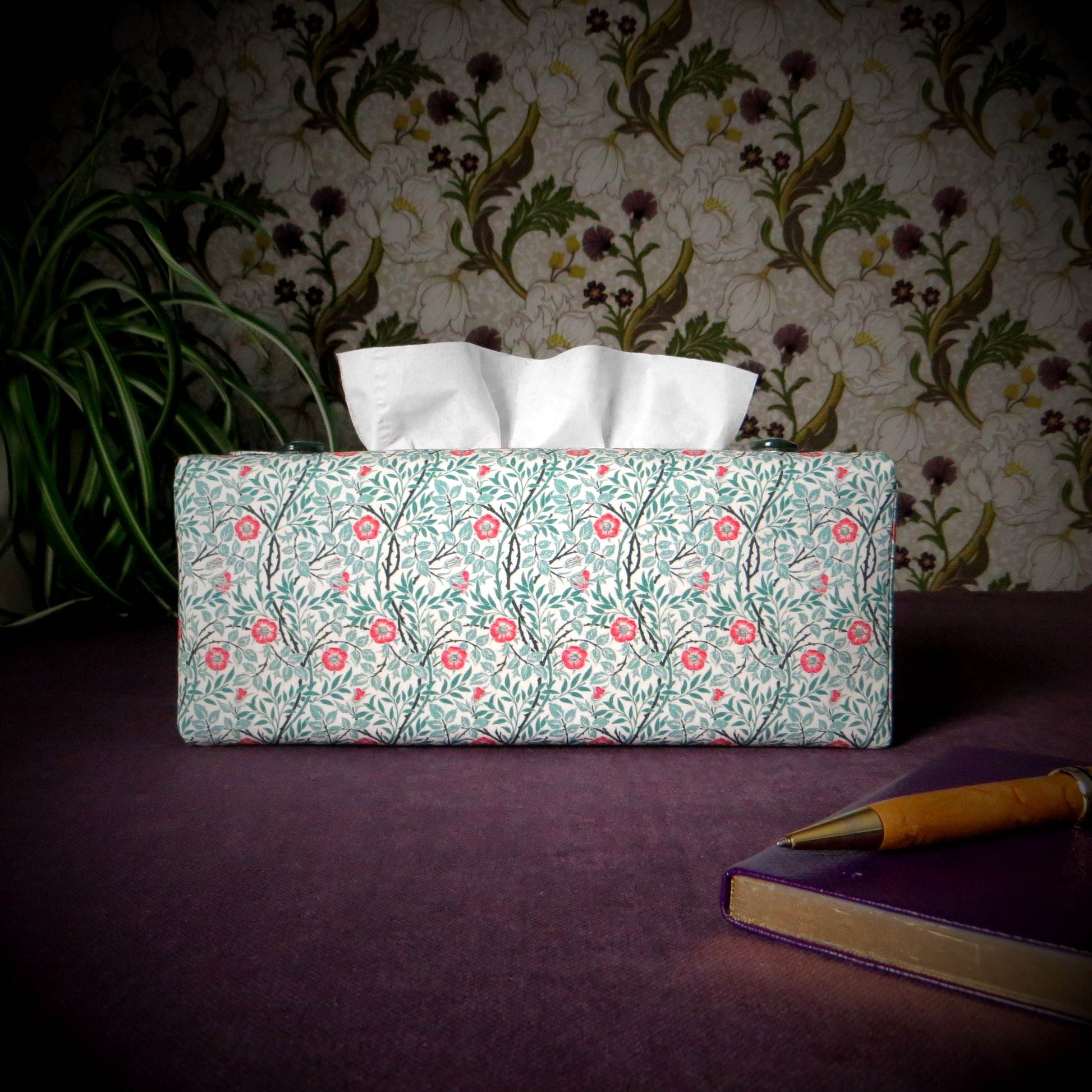This rectangular fabric tissue box cover features a beautiful design of red flowers and green vines on an off-white background. Includes a black cotton lining and accented with green buttons and white nylon cord. Handmade at our studio in Glasgow, Scotland.
