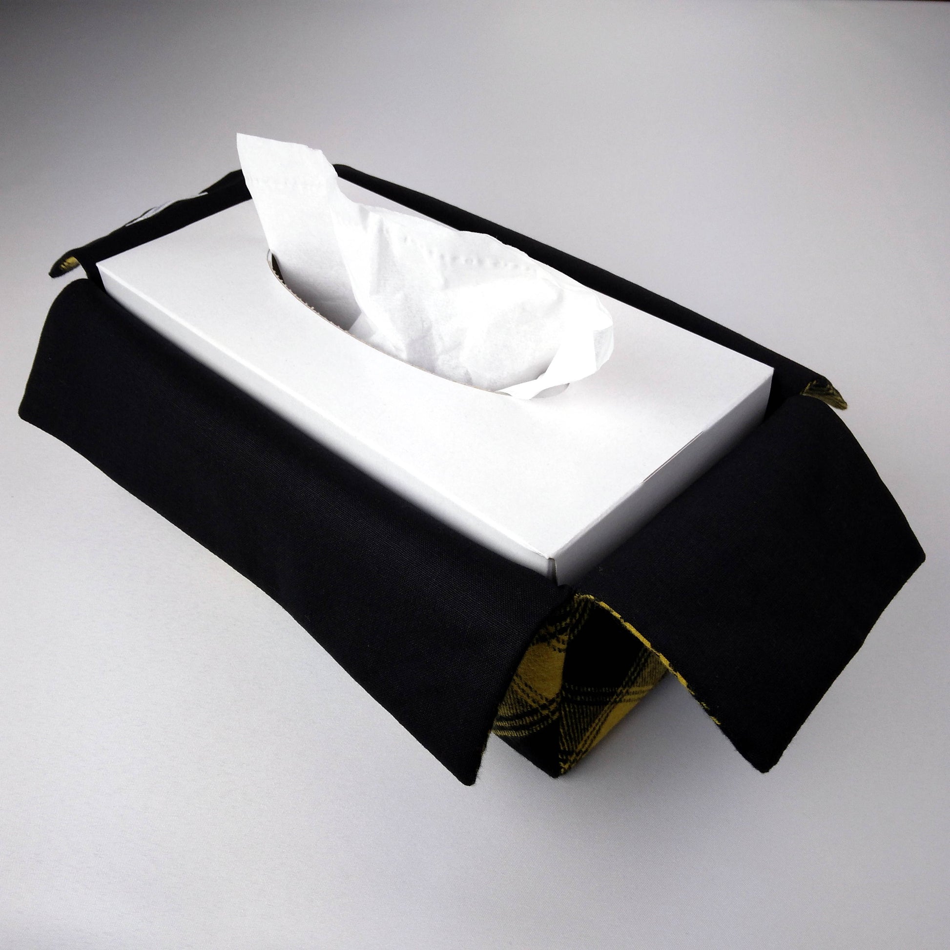 This beautifully crafted rectangular tissue box cover is made with soft, brushed cotton at our studio in Glasgow, Scotland. The bold black and yellow plaid pattern, combined with a black cotton lining, creates an eye-catching design. Pattern placement varies. Complete with black buttons and black nylon cord.